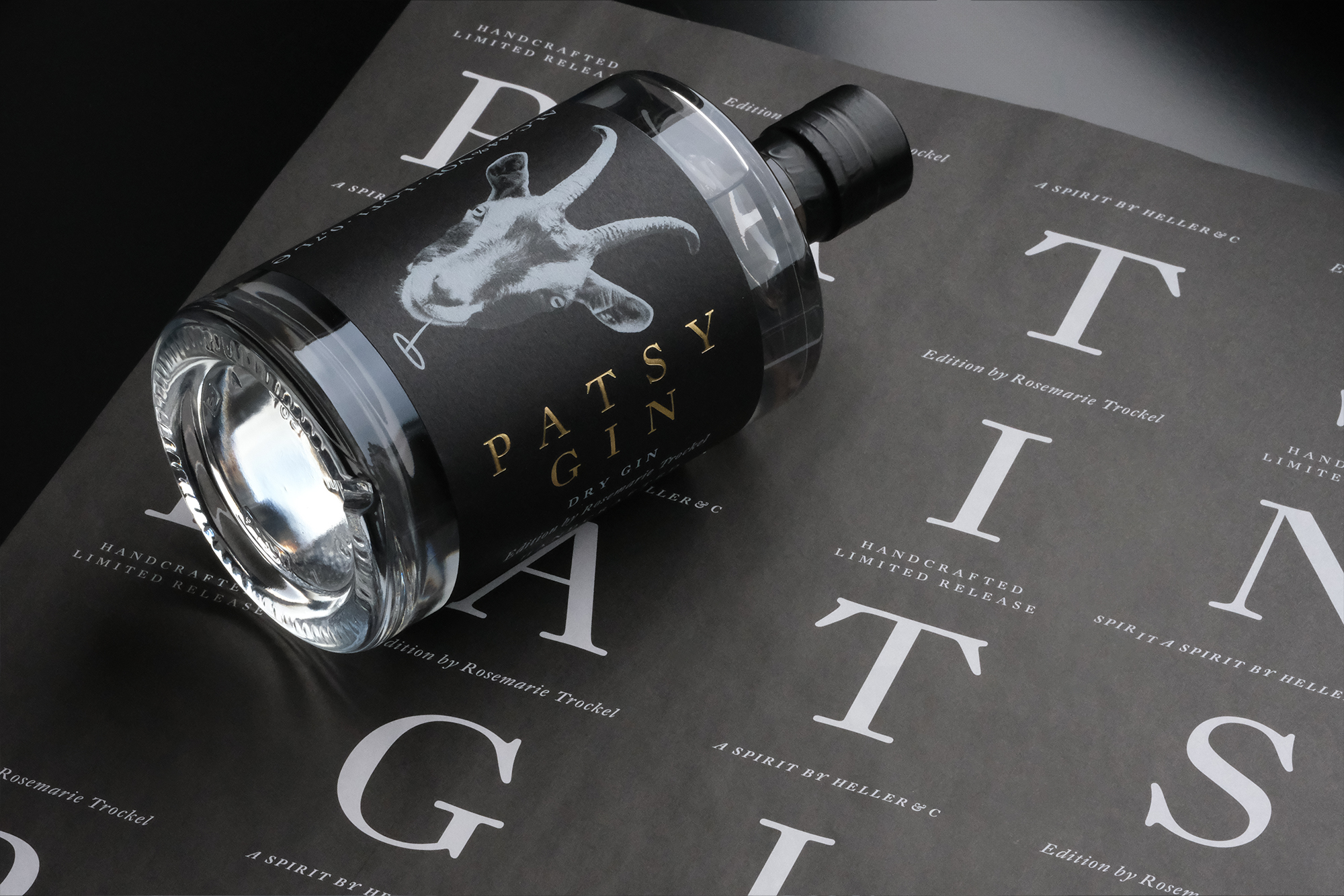 For a recomposition of the HELLER & C x Distillery Kaltenthaler Gin, Rosemarie Trockel contributes a humorously artistic comment — a motive in combination with the Gin’s name PATSY which means ‘Sündenbock’ in German. ‘Bock’ describing a masculine goat, the artist was particularly intrigued by the animal’s gaze.