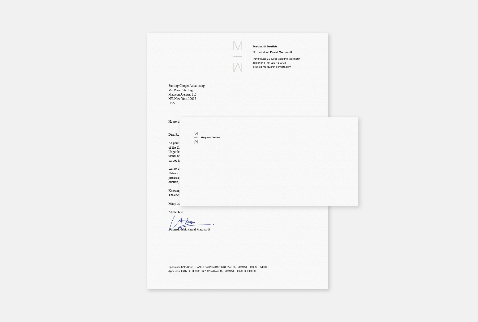 Heller & C develops a visual identity introducing the claim ‘precision in practice’ and a logo mark mirroring the anatomic tooth root and initial letter of founder Dr. Marquardt.